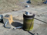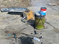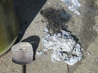 Here’s the spongy, oxidized stuff I took off the top. You don’t want to put this on concrete, because the water in it can cause explosions. This is asphalt, so it just melts and burns. I should have had my ingot mold handy.