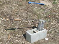 Speaking of charcoal, another problem is clinker. Charcoal briquettes are cheap and convenient because it is easy to break them in half by tapping on the end with a hammer. This is a nice size for this kind of furnace. But briquettes have coal dust in them, so they will form clinker, which is a nasty mass of glassy, black leftover junk. We don’t notice this in a barbecue grill, but you go through fuel a lot faster with blast. If you find yourself adding more and more blast to maintain the same heat, you probably have a layer of clinker blocking your air. Lump charcoal costs a lot more and takes more effort to break to the right sizes. But it is probably worth it if you’re not doing a lot of this. Wood doesn’t make clinker! However this becomes more of an issue when you burn all day and run through a few backs of charcoal to make ingots. This project took less than a bag, which wasn’t enough to build up clinker with name-brand briquettes. But the cheap stuff would have because it has more coal and less wood.