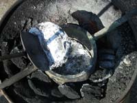 Once we have enough metal melted, we skim. Some folks mount a thrift store stainless steel slotted spoon on a long handle. My skimmer used to be a fireplace shovel, which I cut and bent to fit my crucible, then cut slots in. The idea is to remove the spongy oxidized junk from the top and leave behind the shiny molten metal. Whatever you use, preheat it before sticking it in your metal or you’ll suck out too much heat and freeze the metal. (Doesn’t it feel strange to talk about freezing at over 1000 degrees F?)