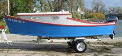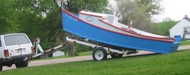 Retrieval is not quite so tidy as launching. I had to get my feet wet walking on the trailer frame to guide the boat onto its bunks. This would have been easier with goalpost-type loading guides, but I still would have gotten wet to crank the winch. But I guess getting wet once is better than twice. I think if my bow eye had been at the right height I could probably pull the boat into a set of goalposts and cleat it to the tongue extension, then winch and shove it into place after pulling out of the water. But this is a guess, and it probably would have required rollers to work.
