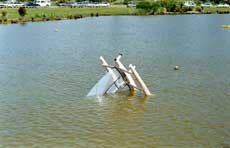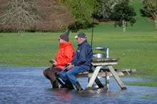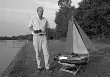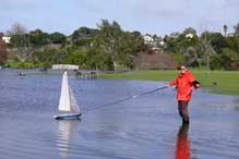When Auckland, New Zealand’s Onepoto sailing pond flooded last year, a few brave Ancient Mariner windlers still came down to sail. Murray White in the red jacket proved he could walk on water, keep his balance and sail his Starlet Southern Cross at the same time, and he and Ron Rule sailed and fished for eels convinced in their theory that eels respond to radio frequencies in RC transmitters.