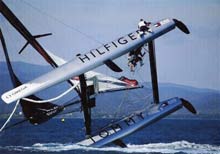 Multihull excitement! In the real world, in the Extreme 40 Sailing Series 2008 iShares Cup, Tommy Hilfiger pitchpoles spectacularly on the second day in Hyeres, France (top left) while in the second photograph, the model racing trimaran, Granny’s Chair has totally flipped, drowned Granny and downsided itself at Onepoto lagoon in Auckland. Even in model guise, these things move fast and can become difficult to keep upended.
