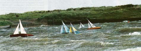 Serious model yacht racing does however have its moments and this photograph above) (maybe by Mike Kemp, I’m not sure) taken at Fleetwood, UK on a one metre day when the wind was blowing a right hoolie and white cap water was everywhere is a spectacular one. Cleared for my use years ago by that lovely man, the late John Cundell who at the time edited Model Boats, it shows the `lunatic weather extremes’ that the serious and dedicated model yacht racer is often prepared to go to in pursuit of competitive edge and glory ! Had I been there I would have proudly saluted them had I been able to get my hand up in the `force whatever’ breeze it appears to have been, in order to do have done so !