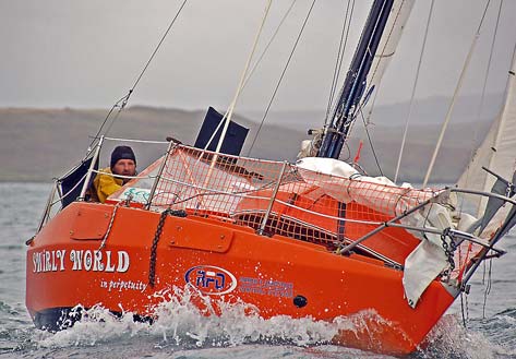 I had done an article on him when he lived on a houseboat on the Thames in England, and I have since thrice read his very entertaining book Swirly World. The 18’ boat, full name Swirly World in Perpetuity in appearance was a miniature ocean-going keeler with a flush deck and a one man cockpit someone told him about and he found floating bow down in Auckland’s Little Shoal Bay. When he was twelve he had owned and raced a P Class boat called Tin Ribs, and if my memory serves me right, I read somewhere that in it he once beat Russell Coutts, and I mean `the one and only one of America’s Cup acclaim!’ A real voyager at heart, aboard the once pea green in colour Swirly World, Andrew made a quick 1,400 mile sail to Sunday Island and back and also sailed her from New Plymouth in New Zealand to Queensland, Australia where as the smallest boat he lined up for an ocean race back to his homeland. All of this is documented in his book written about in a previous column on Duckworks (and I believe still available)