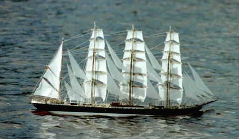 One of the absolutely finest boat modelers in the world has to be Andreas Gondesen of Ausackerwesterholz in Germany who for more than 25 years has specialized in sailing ships. I have written about him before in the now defunct magazine, Windling World and his RC sailing models of both the Pamir and `Old Ironsides’ the Constitution shown above are tributes to the skill and the patience of this modeller. His 2 metre long Constitution with its hull made of walnut took him 3 years and 3,000 hours and is a highly acclaimed working model of the famous frigate, one of six warships authorized by the US Congress in 1794. Gondesen’s Pamir built to a scale of 1:75 and with a length of 1,52m has RC functions controlling rudder, foremast yard braces, main and mizzen braces and spanker boom pulling over the jibs. It shows her as she was in 1957 when she capsized and sank in the Atlantic.