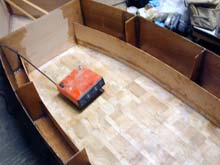 The first step was to cut the 16" high side pieces and connect them with butt blocks into full lengths. The ends were stitched together and the sides set up and spread apart with the two bulkheads. The bottom of the cockpit area was cut to fit the curve of the sides. |