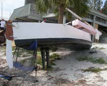 On the beach at the Small Boat Festival in Sarasota, Florida, spring 2007. I had discovered that I could only get up to 3.5 knots with the pedal unit but could row more easily at that speed and reach 4 knots with effort. So I added sponsons for sailing safety and also to give a 5' wide spread for the oarlocks. I eventually abandoned the pedalling because it was too complicated and inefficient in the linkage, in favor of sailing and rowing. I glassed over the box, but left it in place. The bottom is coated with epoxy with graphite powder filler. |