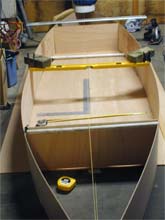 | Then 4" strips were cut off of the bottom edge of the side pieces and the edges of the bottom piece. These two pieces formed a notch in the chine area. The bulkheads and ends were then glassed with tape and the hull turned over so the inner corner of the notch could be glassed. This picture shows the bottom of the boat without the bottom ply in place. |