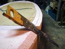 After levelling the foam to be even with the ply bottom and the hull sides the next step was to cut a 45* angle to begin the chine shaping. |