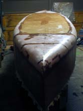4" wide strips of 3mm ply were glassed in the cockpit to form storage bins and stiffen the 3mm hull sides. The Mirage drive well was inserted through the foam in the stern compartment with the idea of having a remote pedal system to leave the cockpit area open for sleeping. Since the boat draws only 3" to 4" the end compartments are self-draining. |