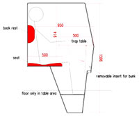 The top view shows a possible lay out. The “Butterfly” was 84 cm wide, the KD 650 is 92 cm wide. This 8 cm makes a big difference. It is now possible to have a L-shaped seating arrangement. See next picture . The port hull sleeps 2 and has a toilet under one of the bunks. The starboard hull has a seating area with a folding table and a small pantry with cooker and sink. The seat area can be converted to an other bunk. By the way, the pantry is an option, I personal prefer to cook on deck. The wet lockers can be used for ropes, the anchor and other deck gear not in use. Under the bunks are huge storage areas. The compartments under the wet locker and the aft bunk under the wet locker and the aft bunk respectable the lower area under behind the pantry make the boat unsinkable.