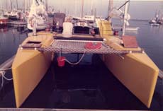 Starboard hull looking forward. The folding table and the mast box at the right can be seen