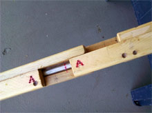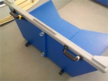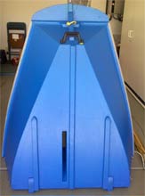 Bottom of forward hull showing daggerboard slot (offset to clear mast) and the three skids. The handle is to assist in transport to the water or back to vehicle. The two little skid extensions are really hull interlocks, preventing the two sections from twisting away from each other. |