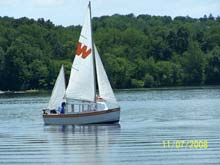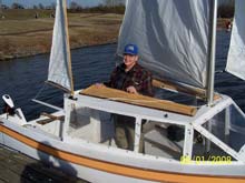 After sorting out the stuck, swing -down, off-center-board as well as the lee helm (see letter of .Oct 07’- Dec. DW) , I had about eight more sails that first year. As I wrote then to Chuck: “I cut it out and built a daggerboard .. roughly 2' x 3&1/2 ', same area. Doing so moved the center of resistance forward 6". Voila! a bit of weather helm .. light in light air, a bit more with a breeze ... just right.” Being able to tow up to the lake and sail with ease, keeping pace with a Potter 15, was a great confirmation of the concept. I haven’t any pictures from that period, but here are a couple in light air this past summer, at Lake Nockamixon, a sailing hot spot an hour north of Philly. There have been no changes to her rig or looks since, although I did add a 4“ bridge deck behind the cabin bulk head. There‘s a pulley and clam cleat for the main; she’s so steady that it’s entirely safe under 10 kts. It’s also cot two cup holders on either side and a 4” lip off the floor below which make a handy stowage for little things.
