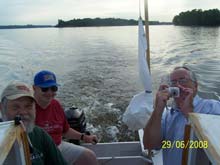 Happily, that first season extended well into Winter. Next are a couple of pictures from Thanksgiving week 07’ when my son was in from Oakland, CA. It was a beautiful, but calm day and a special pleasure to have my son, his son, and an old friend of his aboard. (You know you’re “old” yourself when your 44 year old son has an ‘old friend’.) This was the first time I was able sit in the cabin myself and appreciate the full headroom and panoramic view out all those windows. This is Lake Galena - Peace Valley Park, Bucks County, barely a half hour from home, a major lay-over for thousands of geese and ducks. There was just a wisp of air moving and we ghosted along for nearly an hour until it became still. The little electric trolling motor then got us in at maybe 3 knots on glass-like water at full power; 2 knots at ½ power. In light air the MinnKota and a large rudder provide ample control. A memorable day both for having the boys aboard, and for Nature’s exquisite beauty.