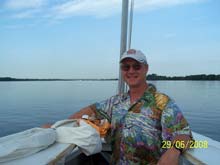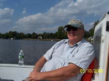 In early July Steve B. and I launched on the Rancocas and went down the river to the same place for lunch. It was piping up at 10 - 12 and a couple of tacks had us at the buoy out from Dredge Harbor so we dropped the main and loosed the jib and mizzen to motor up the narrow winding channel for lunch at the Marina. By the time we ate and puttered out to the Delaware again it was blowing .. 13 - 17, with gusts to 20 or more. With the two of us aboard she just grabbed all that power and bit into the 1 - 1&½ sea. What a ball ! She will heel a bit, and we gave in and both sat to windward; but then she just steadies and goes. I gave Steve the tiller, and for the first time we took a bit of spray on the windows and even in to the cockpit. After a couple of tacks up-wind, down-river we headed north on a long rolling run, steering to keep her wing-on-wing and using that broad transom to push her past hull speed now and again. Wish we had had a gps. Steve tells me “she a had a bone in her teeth” and indeed, she handles well on all points of sail, never thinking about going over but finally giving us a bit of a thrill. That mast is un-stayed, by the way, resting in a box on the bottom and up through a slot in the roof - the forward bulk head is heavily reinforced. This is no problem … but that two-piece aluminum mast does bend over a good foot at the tip, spoiling the sail shape up there and de-powering her a bit. I’m going to add the side shrouds this Spring.