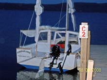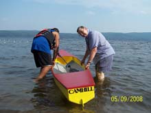 There were a couple of other Summer sails on Nockamixon, alone and with friends, and I would have sailed more in August, but I was busy building a Michalack Toto for and with my son-in-law. This was a snap compared to the year before, and we pushed so we could take both boats up to Lake George. This is the destination which spawned the whole concept of designing a pocket cruiser and using that old Snark Wildflower rig. Come early Sept. 08’ we finally took them both to Trout House, Hague, NY. The lake there is 3 mi. across and the wind comes up 15 - 18 miles or open water from the South at mid-morning most days. We dedicated the Toto the “CamHill” (my daughter) and watched with pleasure as Kareem proved her seaworthiness.