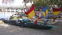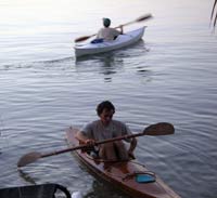 | Matt Layden (Wizard) paddles one of his older kayak designs while his wife Karen paddles his EC boat at the finish line in Key Largo. |