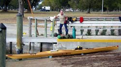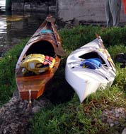 | Stripbuilder and his lovely kayak at the Flamingo ramp. Note he has foam cushions under it to protect that stunning finish. |