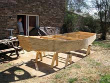 I built her over a 7 or 8 month period starting the end of 2007. As I have to build outdoors and without permanent shelter, I began by making the bulkheads, leeboard, rudder and stock, and oars while waiting for weather warm enough to cure epoxy to move outdoors.