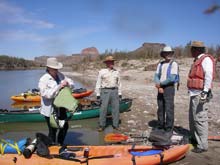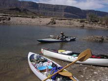 | The first night we spent at the Castolon campground. Unfortunately, floods earlier in the year had wiped out half the campsites. So our group had to double up. Skip's unusual boat draws a lot of attention - here a total stranger walked up and examined it closely. Of course Skip was not shy about showing it off. |