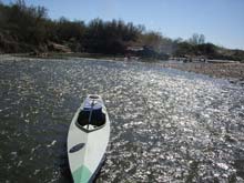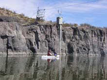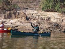 | There are numerous riffles like this one along the river since it is pretty low. All the plastic boats were able to go bouncing over the rocks without worry - even Skip's boat seemed immune to damage. But I had a cheap plywood boat and I often walked the first day or two. Here the current takes the boat out in front as I hold the painter. You can see the other boats downriver. Later I learned to just back-paddle to go slow enough to avoid holing my boat. |