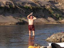 | Temperatures ran as high at 95 degrees F during the say so it is not strange that John sought a cool bath as soon as we made camp. He did this most afternoons, putting most of the rest of us dirty birds to shame. |