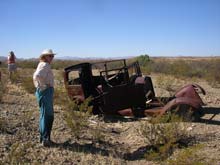 Sure enough there were sights to see on top of the bluff. Here, an ancient automobile rusts away in the Texas sun as Donna looks on and Louis takes a picture. |
