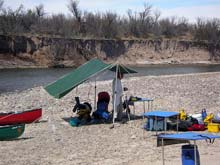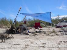 | It has been another hot day so when we stop around mid afternoon, Skip and I rig a sun shelter from a tarp and a couple of paddles. We thougth we were pretty clever... |
