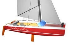 Here’s a rendering of Mike Lenenman’s Beach cruiser 22. It has most of what I would want in a quick to launch beach cruiser. |