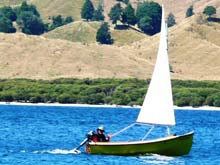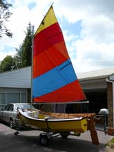 Onto to Trade-Me (NZ equivalent of E-bay) I went, and found the mast and sail from a 13 ft ‘Seabird’ sailing dinghy – a fibreglass ‘clinker’ replica, hull design. It had a 2 piece mast, a bit under 6m (19ft), with a Bermudan, loose-footed, multi-coloured sail, a reasonable mainsheet and 2x good blocks attached. This was a more manageable arrangement. It sailed quite well and was much more predictable than the phoenix design, but I hated the 5 coloured sail.