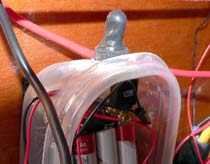 | A low-cost, water-tight food storage container makes a good fit for for 8 AA batteries to power a red LED light for the compass. If the switch, wire connections, and box stay watertight, this system would run underwater! |