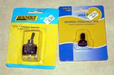 My box also has a switch because the lights need to be turned on and off. If it were for a GPS, a switch might not be needed because the unit could simply be turned off or unplugged. The toggle switch is made by Seachoice, and has an optional rubberized, "universal toggle boot seal" (yes, it looks like a switch condom) that is advertised to make the switch water resistant. (The boot is made by Marpac.)