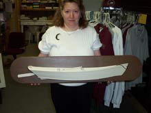 Debbie Shertz, Administrative Assistant at the Upper Bay Museum in North East, holding a locally made half hull model. |