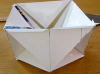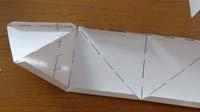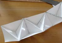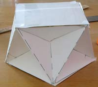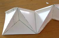 5 - Now bend the side-tabs on the lower edge of the accordion strip back out and tape the small triangles—each to two of the tabs. Then flip it over and tape in the other 4 triangles. If this has all worked according to plan, you will now have 8 corner cubes with each one facing out 45 degrees around from the previous one. |
