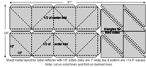 When using a direct-returning “corner cube” (trihedral) shape, the reflected power is related to the fourth power of the linear dimensions of the reflector. I will not reiterate the discussion of the first article except to indicate that the final calculations of the 7-inch-on-a-side design showed that it would be not quite meet the target reflectance in all cases of 2.5m2 RCS (Radar Cross Section). The formula for the RCS of a triangular trihedral on axis is 4.19*a4/λ2 where a is the length of one side of the triangle (about 7" in my first case) and, for X-band radar, λ is about 2.5 cm. That gives a maximum RCS of about 7 m2 for a 7” corner. A little piece of aluminum about 10” on the long edges looks to distant radar like a sphere almost 10’ in diameter!