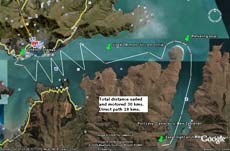 The outbound leg started in 20 knot conditions which moderated to 15 knots late in the day. It was here that I really began to question the concept of sailing as a way of going somewhere without resorting to fossil fuels! The only way out of the harbour was close hauled and my progress to windward was pitiful. I have noticed that in calm water Philsboat's performance is reasonable, but in the rough chop my progress to windward was poor. In an effort to make some headway, I let OUT a reef. The boat ended up with water over it's wales several times, but simply letting the sail out was enough to right it. Paradoxically, sailing Philsboat at high angles of heel, gives you a much better view, since you end up looking out of the slot rather than through the salt sprayed windows!