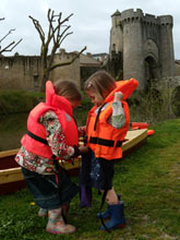 Rachel clips Maia into her life jacket on the big day, on the Thouet River in front of St. Jacques’ Gate in Parthenay, France, near where we live. |