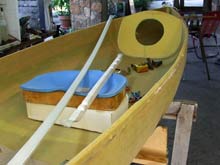 Paint still a little tacky weather has turned cool and damp again. Moved boat out into sun. Start checking out other gear, tent hasn’t been set up since the Ruta Maya five years ago. Screw in hatches and cut some lines for tiedowns. Start fabricating foot rest, cut out and glue pieces together. Revarnish paddle shafts, single and double.