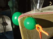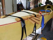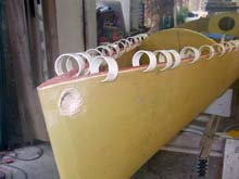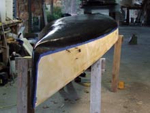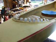 Glued in other gunnel and spacers. Finished sanding bow and stern eyes, then added a piece of braided glass reinforcing using a balloon to force glass into place. Have wanted to do the balloon bit for years since I saw in Gudgeons first book. Really should use bigger balloons but used what was at hand.