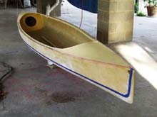 Start on inside. Marked approximate 4” waterline while boat was upside down and level. Also marked major bubbles to be repaired. Cut cradles to support hull right side up. Popped rubber bands loose from inside hull and lifted boat off form. Boat came off form easily. First trip to the scales showed the weighing just less than 17#, not too bad, close to theory. Trimmed the gunnels, sanding a 45 degree bevel on outside edge. Pulled rubber bands and shaped the inside, using sureform to take off the glue beads. Shaping was mostly with DA sander on bottom and sides and a piece of 2” pvc pipe wrapped with 60 grit on the bilges. Added a little klegecell to ends to get solid backing for bow and stern eyes and to simplify putting fabric in ends. Filled major cracks and blowholes with epoxy micro/microballon mix.