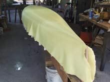 Skin the outside of boat. Got the outside resanded, everything laid out. Susie helped mix and apply epoxy to pre trimmed layer of Kevlar. Was quite windy so I decided to wet Kevlar out through fabric rather than fold back and apply epoxy between foam and Kevlar. Once Kevlar wetted out we rolled on the 4 ounce s-glass and wet it out. Followed by peel ply; had to squeegee more epoxy through peel ply in places since s-glass layer was a fairly dry layup.