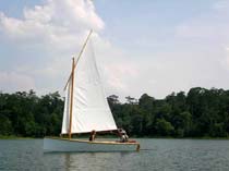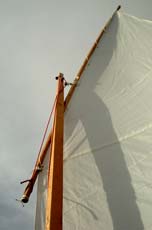 Cleats were installed for the halyard and downhaul and the running rigging was set up according to Storer's instruction, with the exception of using a 3:1 mainsheet instead of the recommended 2:1. My experience with the slightly larger lug on our Jim Michalak Frolic2 design indicated that a 2:1 sheet could be a handful in a breeze. Finally, we attached the sail to the yard and boom, lashing it at the corners and using a lacing along the foot and head; some designers prefer individual ties but Storer specified a lacing and we did it his way.