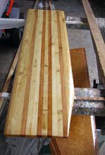 The stripped-glued rudder blade (top) and the ply-laminated rudder (bottom) where shaped, fiberglassed and varnished.