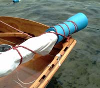 The halyard and sheet are used to lash everything together and tie down the front end to the cleats at the mast step and the aft end to one of the stern cleats. I particularly like how the foam covers the ends of the rolled up sail, the parts hardest to protect from the wind when towing the boat. And of course the foam does an excellent job of protecting the varnish on the spars and the interior. It’s also easier to store than the cross beams. A neat system, which only adds to the ease of using the Goat Island Skiff.
