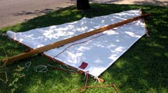 Pardon the diversion. Anyway, we got the GIS sail up with little trouble, and got the sheet rigged. Just before we took a break for lunch, I raised the sail on the Piccup, figuring Olivier would enjoy the contrast.