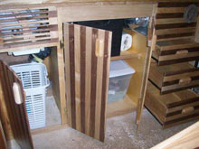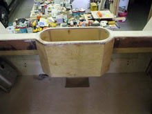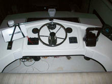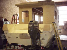 The walls, cabin top and fly bridge were made with ¾” ply. for studs and joists then ¼ Baltic birch ply. was glued and screwed and 6 oz. cloth was applied to the exterior with West System epoxy. All wood was sealed with epoxy.