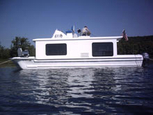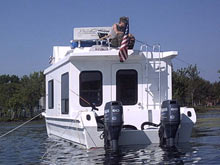 We stripped it down to bare glass, ground and glassed new stringers, floor supports and transom to handle the new outboards, previously had I/O. Power was decided to be two Yamaha high thrust T-60 four strokes. The boat was originally rated for 250 hp but it’s a houseboat not a ski boat. For the floor we used ½”marine ply., then 1” holes were drilled every foot and filled with USCG app. foam from hull to floor then encapsulated in glass.