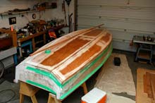 | First half of bottom being glassed and epoxied. I covered the bottom from side/bilge joint to side/bilge joint. This went better than I expected. I did it 1/2 at a time as I was working alone and didn't know if I'd be able to keep up mixing epoxy. It wasn't a problem. The cloth smoothed out nicely and I had virtually no air bubble problems. |