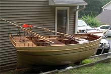 The hull is strip planked with tongue and groove planks. The planks are glued together and screwed to 14 forms attached to a strong back. |